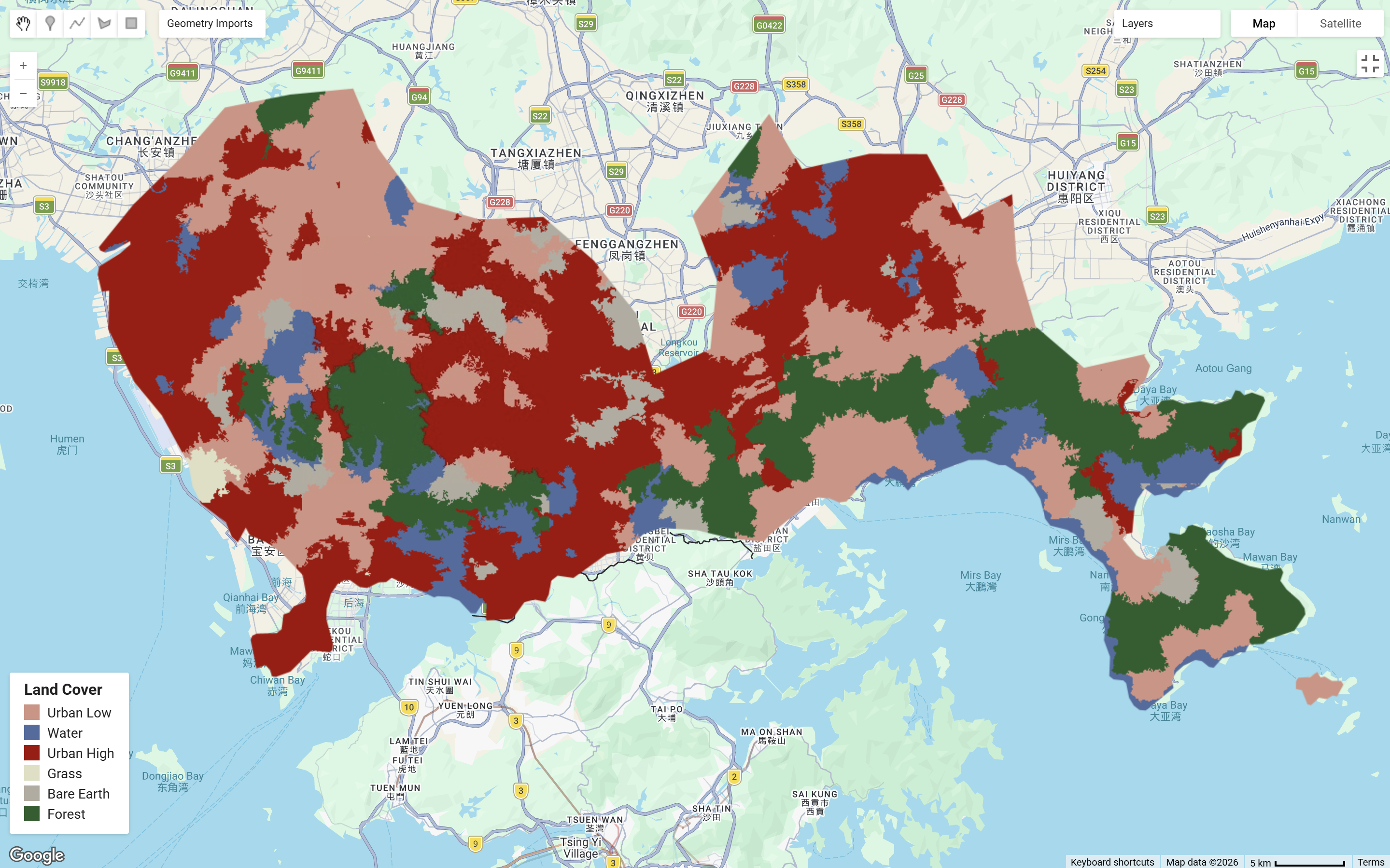Taking it further, there are publicly available pre-classified products that are easily accessible through the Earth Engine Data Catalog. For land use and land cover change analysis, Dynamic World V1 and ESA WorldCover 10 m v200 can be used for land classifiers. The Global Map of Local Climate Zones (LCZ) adds a different perspective by classifying areas according to urban form and surface structure, which makes it more useful for analysing neighbourhood types, urban morphology and urban climate patterns than simple land cover. Beyond these, GEE also includes building datasets such as Open Buildings V3 Polygons for building level analysis across regions and TIGER: US Census Roads for road data but limited to the US.