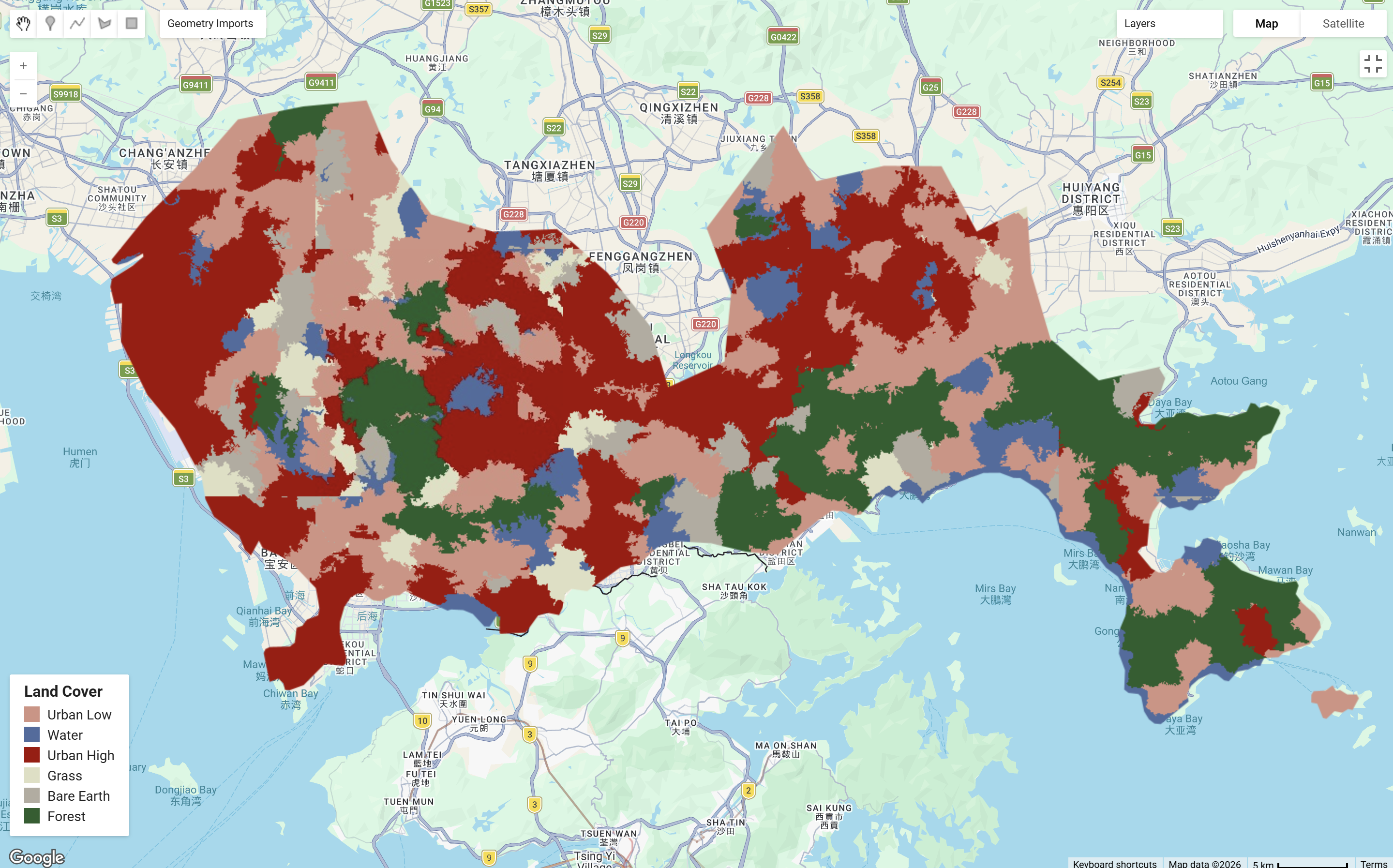 What I found most useful this week was learning that pixel-based classification methods can struggle in urban environments. In a city like Shenzhen, land cover is highly spatially heterogeneous and many neighboring surfaces are spectrally similar. With Landsat’s 30 m spatial resolution, individual pixels often contain mixtures of surfaces such as buildings, roads, and vegetation, which can lead to overestimation of urban land uses (MacLachlan et al. 2017). This made sub-pixel analysis particularly interesting, because instead of classifying each pixel into one class, it is able to estimate the fractional composition of land cover within each pixel (Ge et al. 2014). This is especially useful in urban areas, where mixed pixels are unavoidable. Despite, it poses limitations. Although sub-pixel analysis provides a finer representation of land cover, the output can look noisy and harder to interpret, and some of its advantages may be reduced once fractions are hardened into discrete classes. The below shows Shenzhen under sub-pixel analysis: