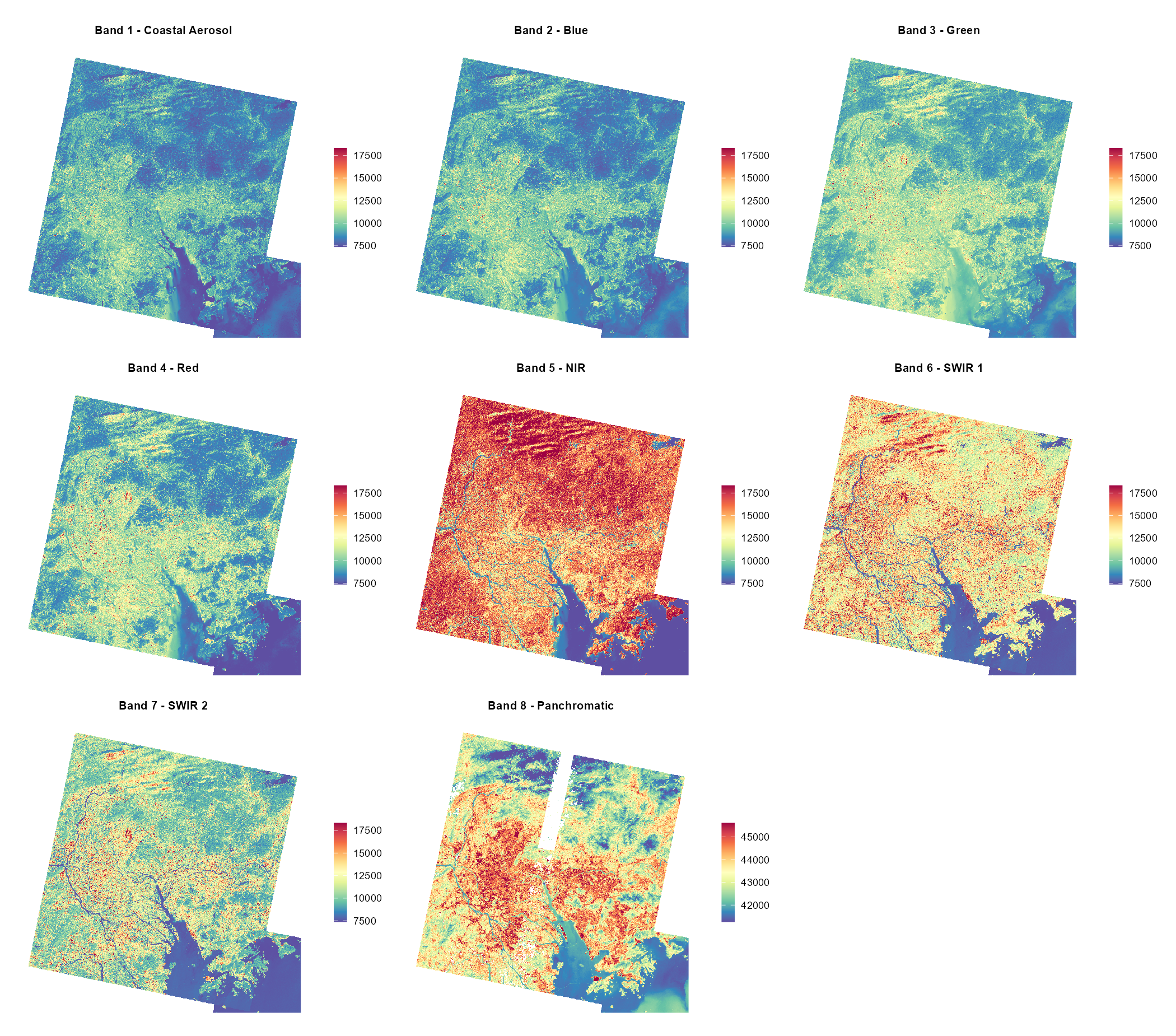 The plot below compares spectral behaviours across different surface features. Each band operates at different wavelengths, Bands 1–7 at 30m resolution and Band 8 at 15m. However, mixed urban surfaces and terrain can produce complex spectral responses, so single-band interpretation is limited without further complementary analysis. For example, Wang et al. (2008) noted that SWIR responds highly to both soil moisture and leaf water content, where combining NIR and SWIR are useful in detecting vegetation moisture conditions, and distinguishing land uses types. More about Landsat bands: USGS.