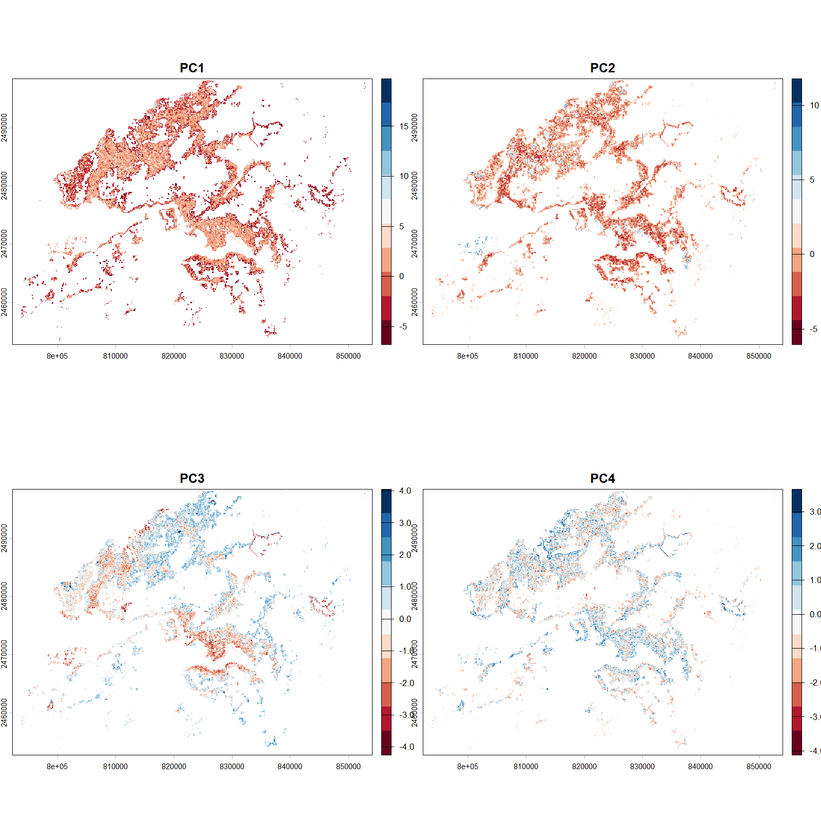 In this case, PC1 to PC4 explains most of the variations, 91% of spectral variance can be identified in the first 4 principle components. This is very helpful as it allows higher efficiency in analysis, including most of total variance while reducing 16 layers to 4 without loosing much information.