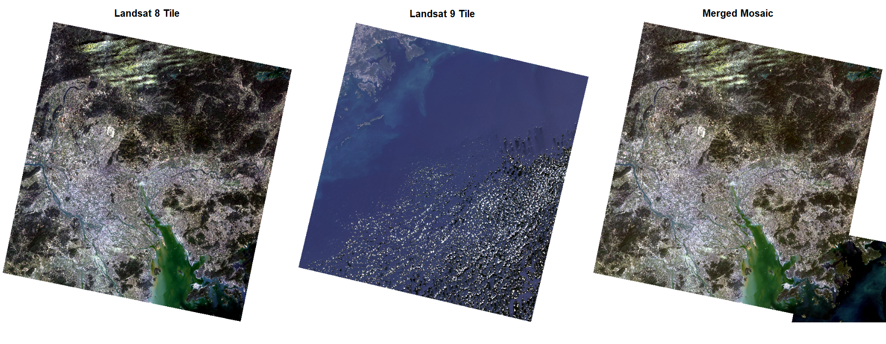 Remotely sensing imagery occasionally requires pre-processing, as sensors may pick up distortions that may affect surface reflectance imagery. This section will focus on correction and enhancements. The following study area of Hong Kong will demonstrate a workflow of mosiacking Landsat 8-9 tiles and imagery enhancements processed through R.